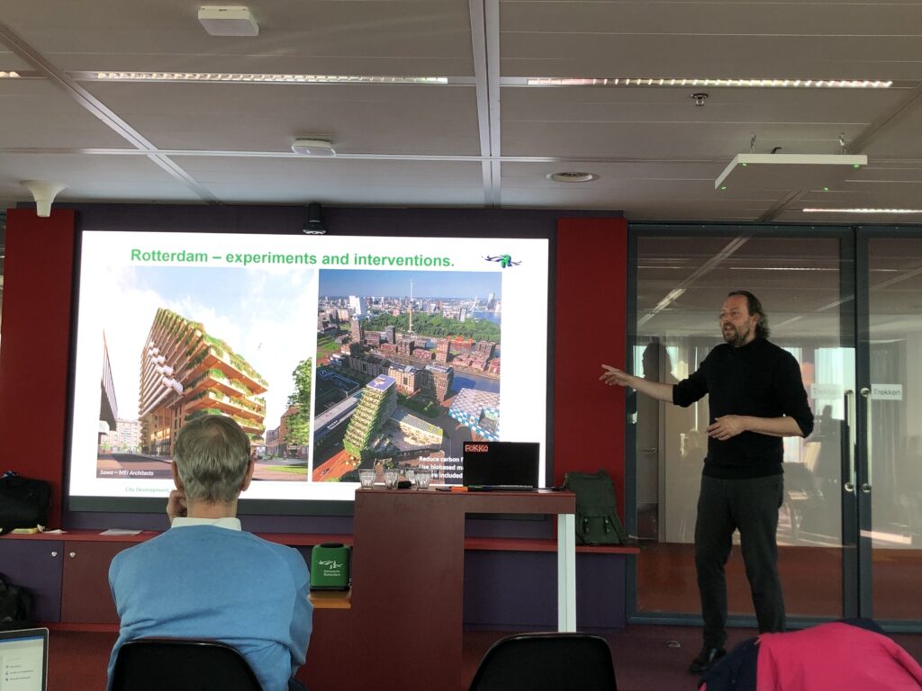 Emiel Arends, Senior Advisor on Urban Affairs for the city of Rotterdam, gave a presentation about how city planning works in Rotterdam; the history of urban development; and more recent developments — e.g. making city less car-centric; tryouts of new types of buildings like the Boijmans Depot and the SAWA wooden building; the pressing need to address an acute housing shortage and to accommodate the increase in single-person households; a new city policy to encourage and facilitate placemaking; and the city’s vision to create a polycentric city. He also talked about the impact of climate change and the city’s strategies to mitigate the impact.