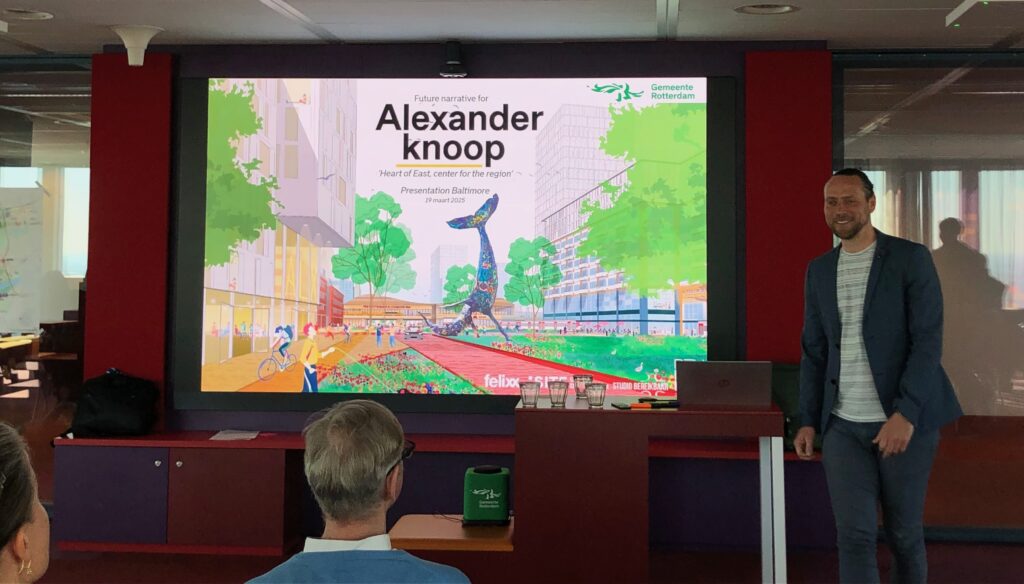 Before the presentations, Hermen Borst, Director of Urban Development at the Municipality of Rotterdam, provided an introduction and talked about the need in Rotterdam for more engagement with the community in city planning, and more focus on placemaking. Then, Baltimore Department of Planning presented to Baltimore students and faculty, Rotterdam city planners, the leader of Architecture Institute Rotterdam (AIR), Baltimore-Rotterdam Sister Cities Committee members and other design professionals. After the Baltimore session, Rotterdam city planners provided presentations.