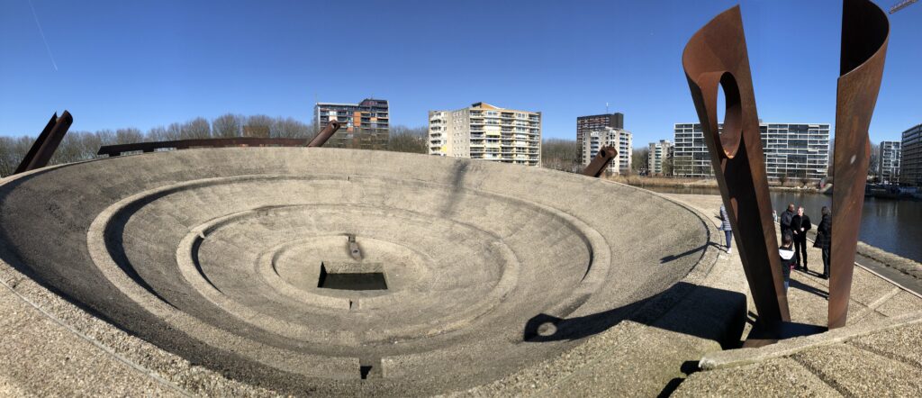 The Lage Land  – the lowest point in the Netherlands – is marked by this huge public art structure in the center of a lake surrounded by high-rise residential buildings. (Photo: Sengers)