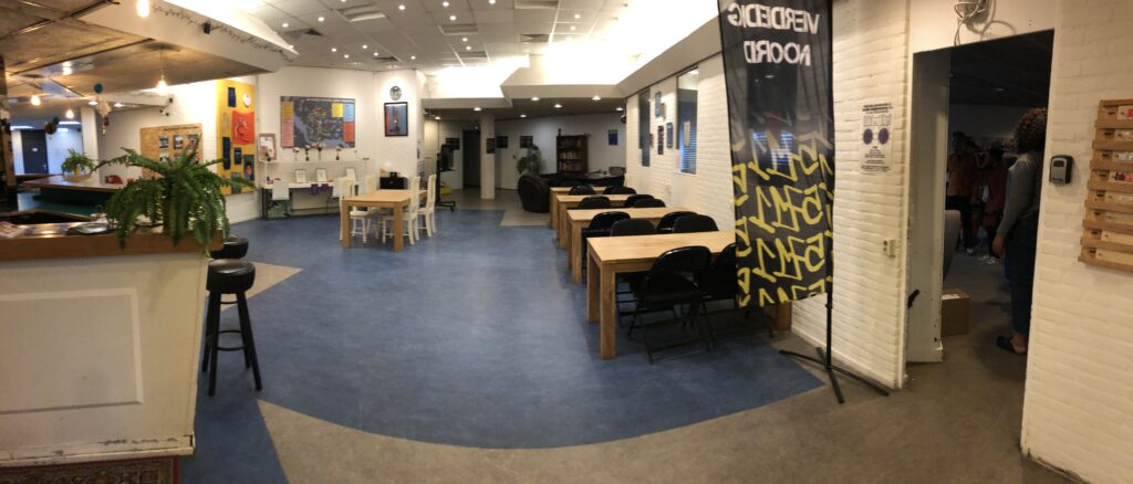 The space include offices of Verdedig Noord (Defend Amsterdam Noord), an organization of community residents that that uses art and activism to fight for solidarity and against gentrification in Amsterdam.